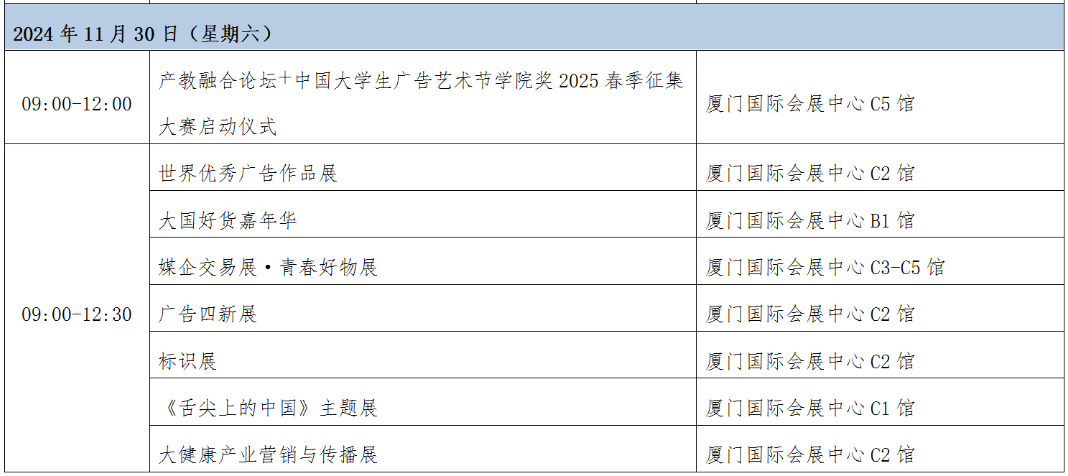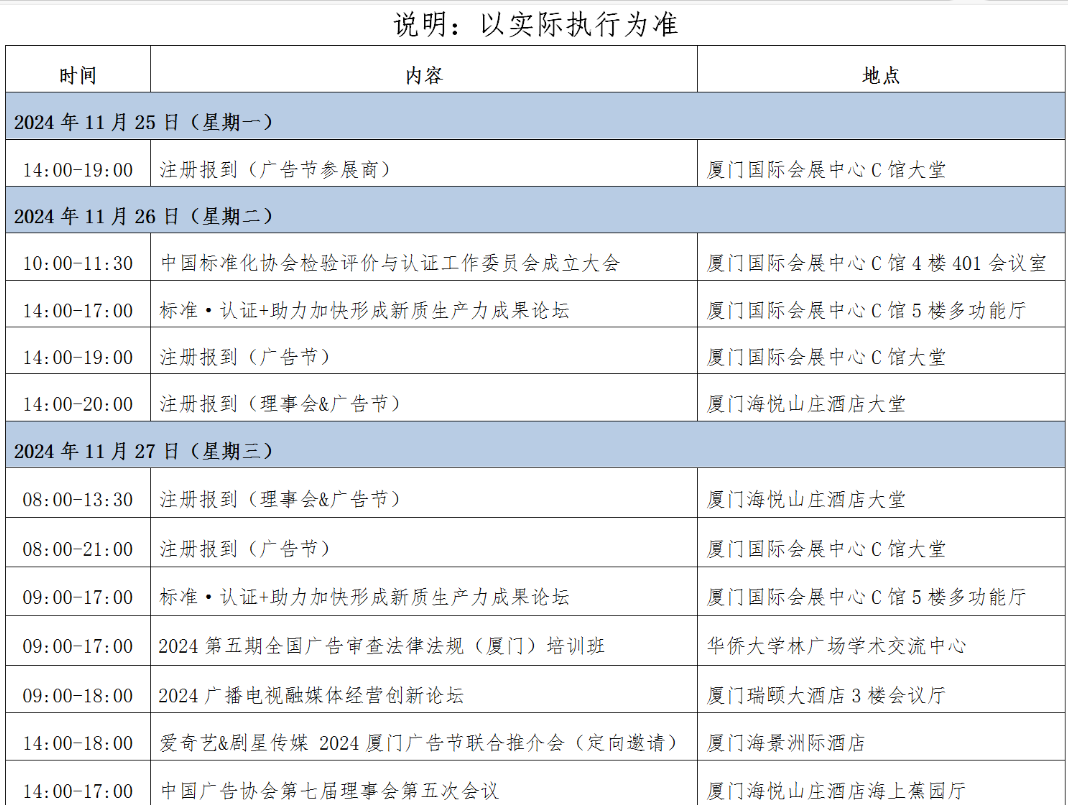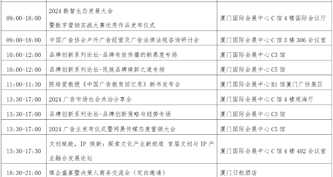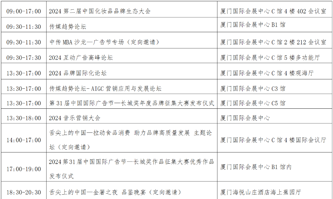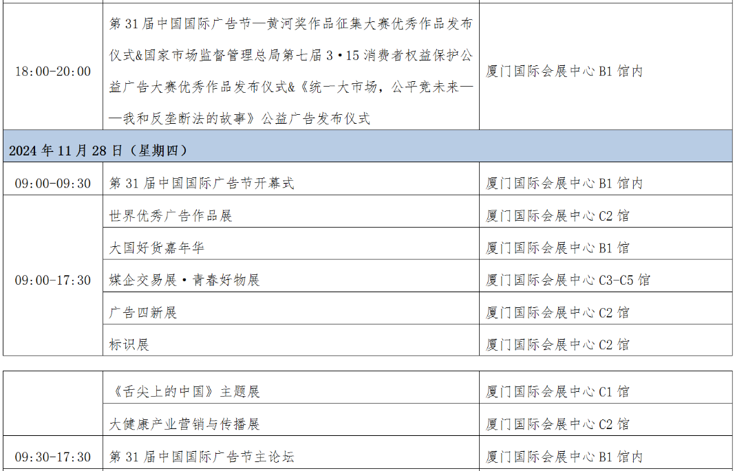 第31届中国国际广告节即将于2024年11月27日至30日(27日报到、28日开幕)在风光旖旎的厦门举行。广告业作为文化产业与现代服务业的重要组成部分,在推动经济转型、优化产业结构中发挥着重要作用。第31届中国国际广告节也将继续深入挖掘展示广告业的积极作用,汇聚行业精英与创新力量,围绕发展新质生产力、AI 新未来、品牌国际化、数字营销、标准认证、元宇宙新消费等多主题开展20余场论坛、7项专业展览、6场营销资源推介会等精彩活动。同时,黄河奖、长城奖、学院奖作品征集大赛发布仪式,广告主盛典等8场赛事盛典也将继续创意呈现。作为中国广告行业具有规模型和影响力的行业盛会,省广协决定组团参会,希望各市州广告协会、各会员单位及全省广告行业相关单位积极组织报名参加,共叙新旧情谊,共话行业发展,共谋未来新篇。(二)参加广告节期间的开幕式、高峰论坛、媒体推介会、展示展览会等所有大型活动。登录中国广告协会官网www.china-caa.org、中国国际广告节官网www.chinaciaf.org点击首页广告节海报或手机扫描下方二维码均可注册。